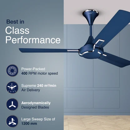 The ceiling fan features a high-speed 400 RPM motor that enables fast and efficient air circulation. This powerful motor ensures that the room is cooled quickly and effectively by delivering air at the rate of 240 cubic metres per minute, offering a pleasant experience during hot weather. Its reliable performance makes it an excellent choice for maintaining a comfortable indoor climate.